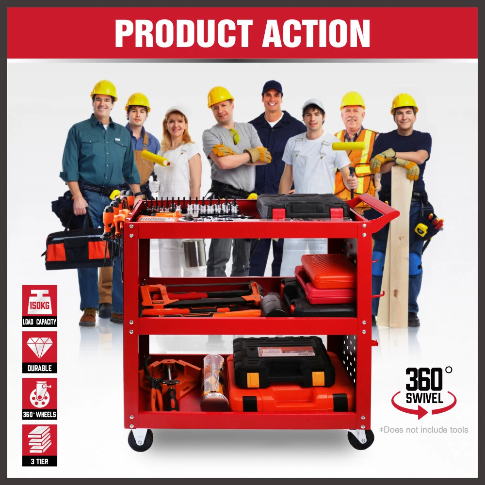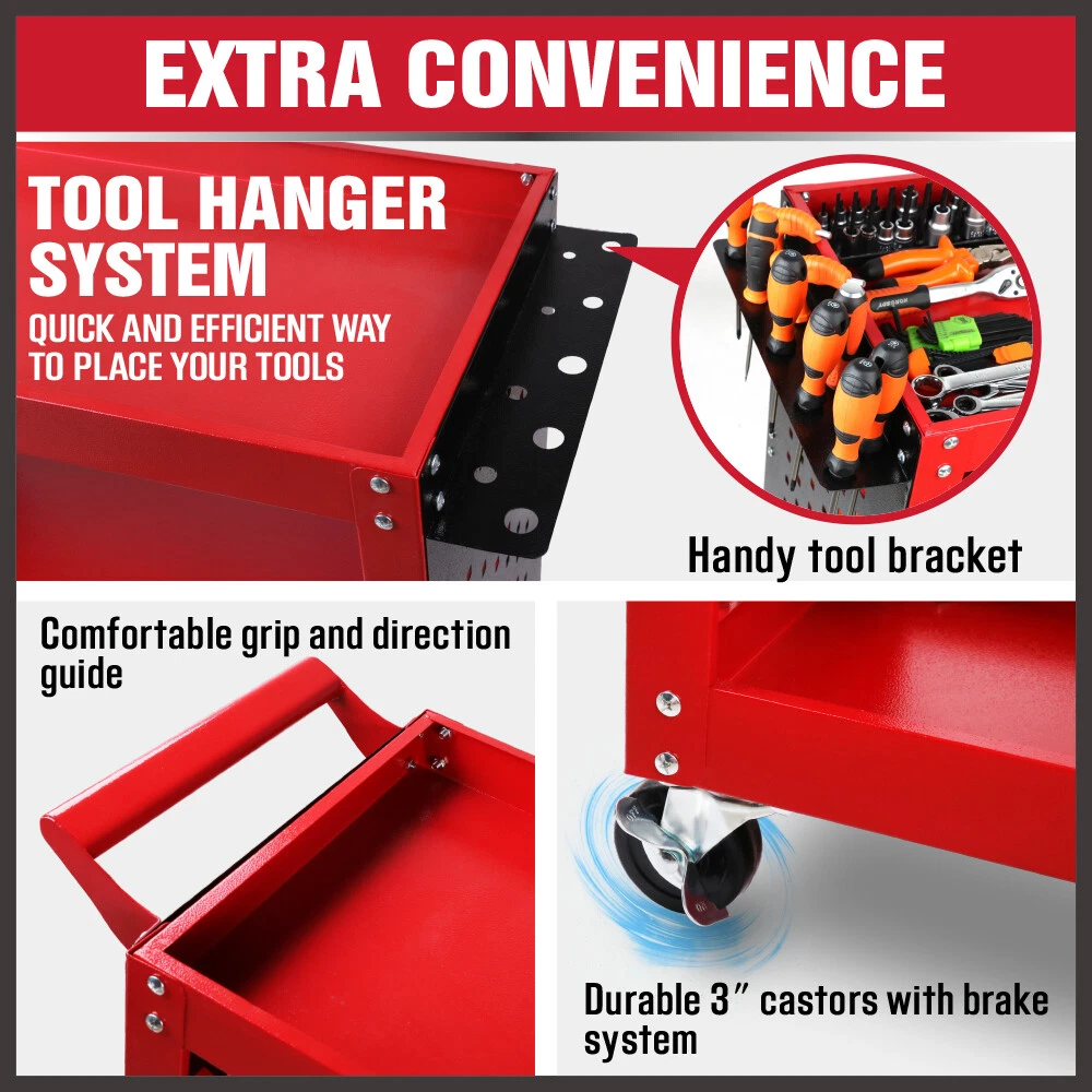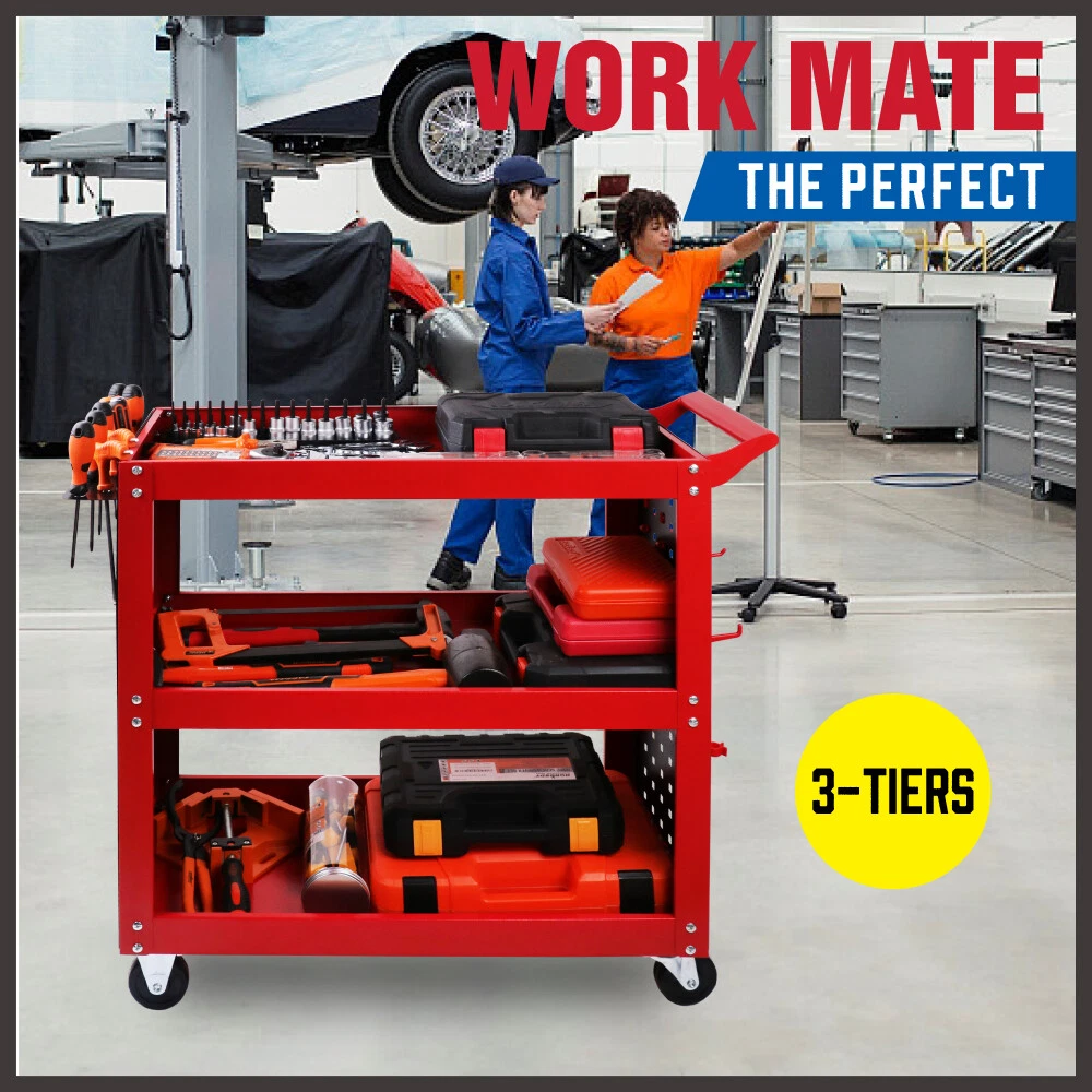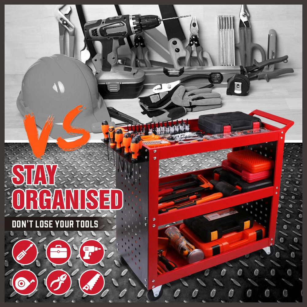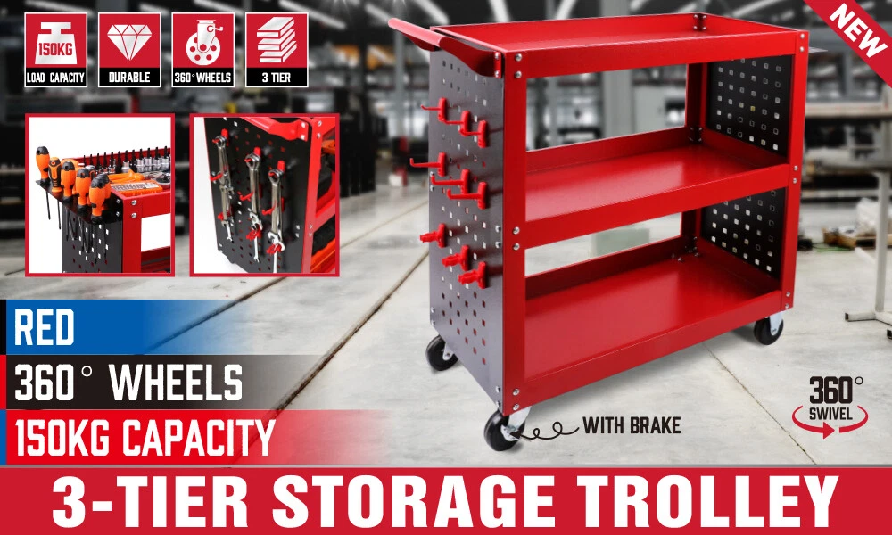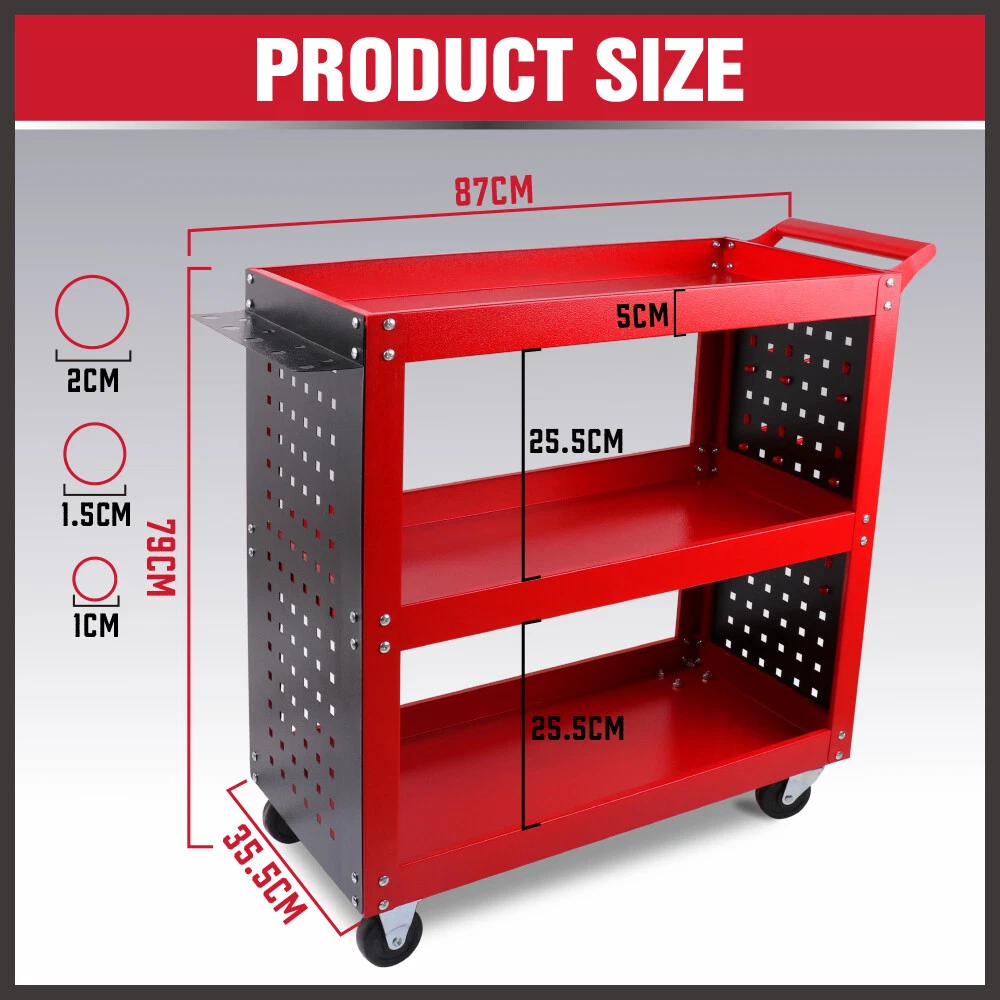 3-Tier Tool Cart with Full Side Panels, Upright Columns, Black Pegboard (Red)
