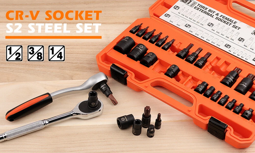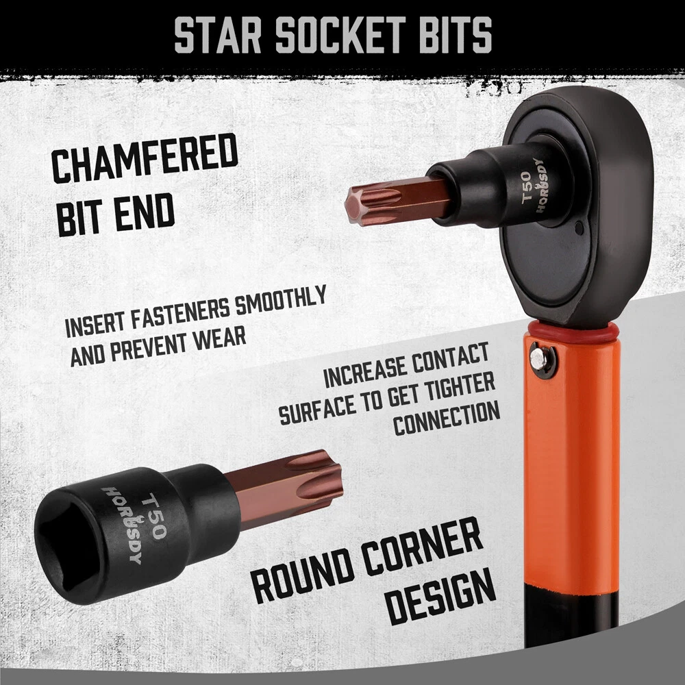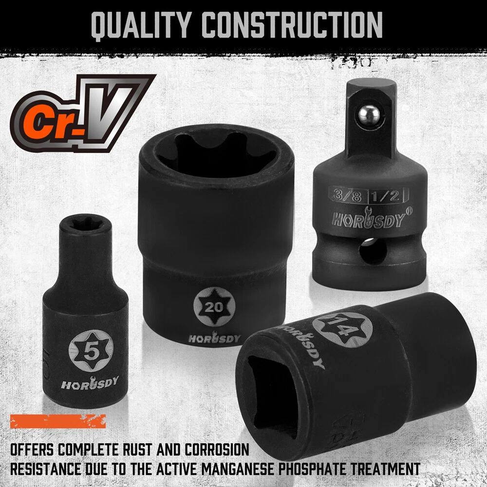 14-Piece Torx socket set is made of S2 alloy Steel and chrome vanadium steel (CR-V) which increases torque and hardness.