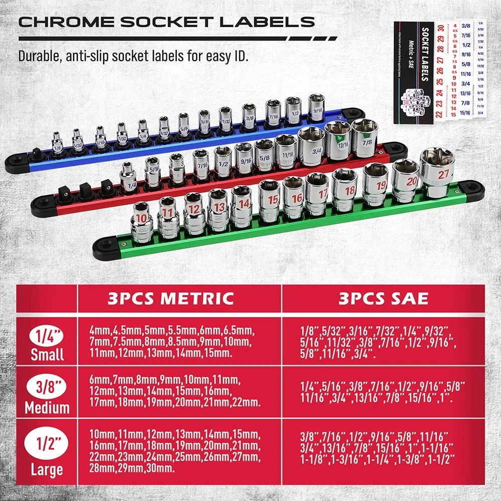 STURDY BUILD – Crafted from durable Aluminum Alloy and ABS, this magnetic socket organizer ensures long-lasting performance and excellent corrosion resistance, keeping your socket sets secure and organized in any environment.
