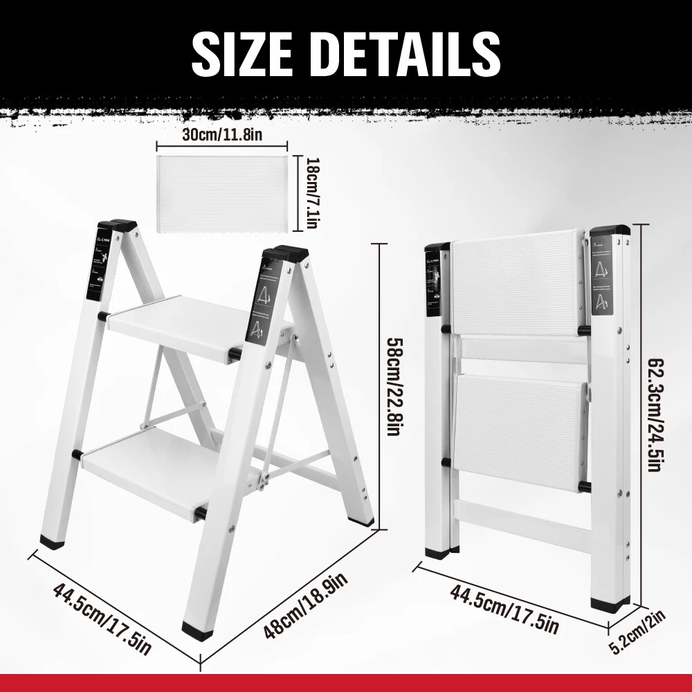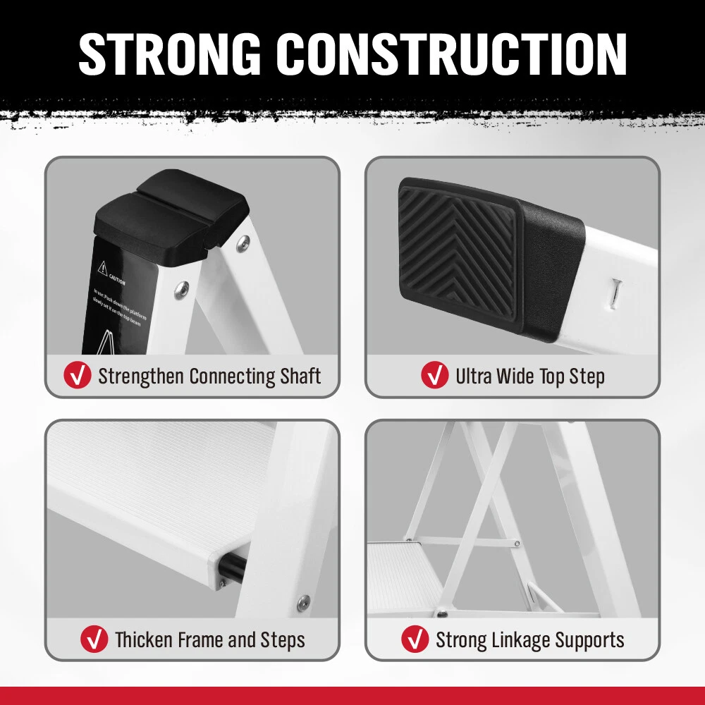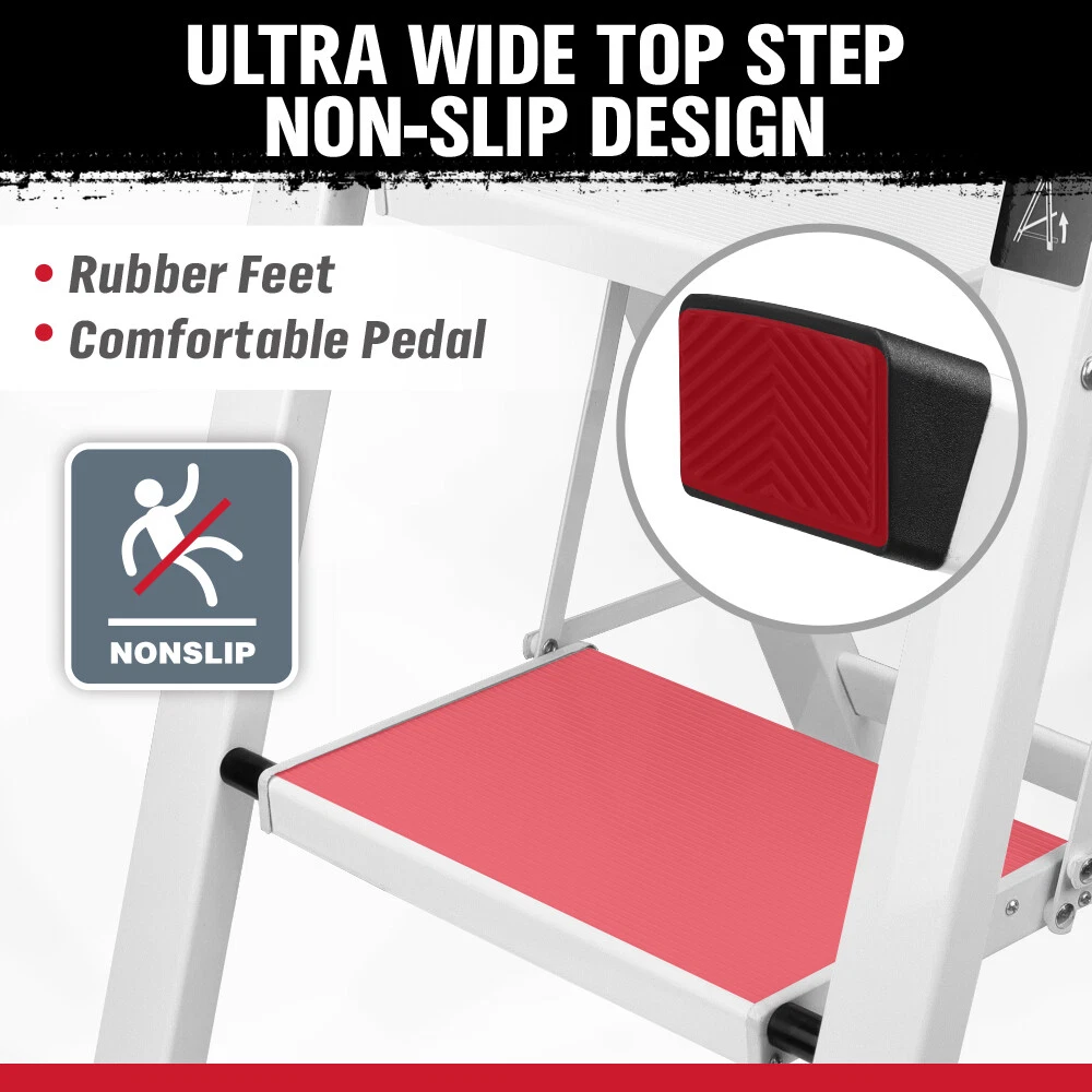 Safe and stable】The ladder adopts a triangular design, which is stable and safe. The widened anti-skid pedals and rubber foot pads increase the anti-skid coefficient,Make sure the stepladder is safe to use.