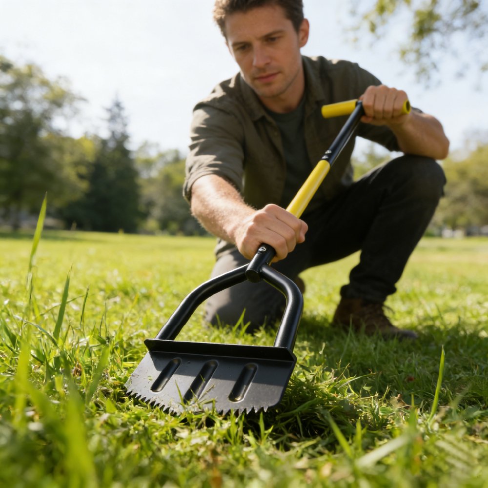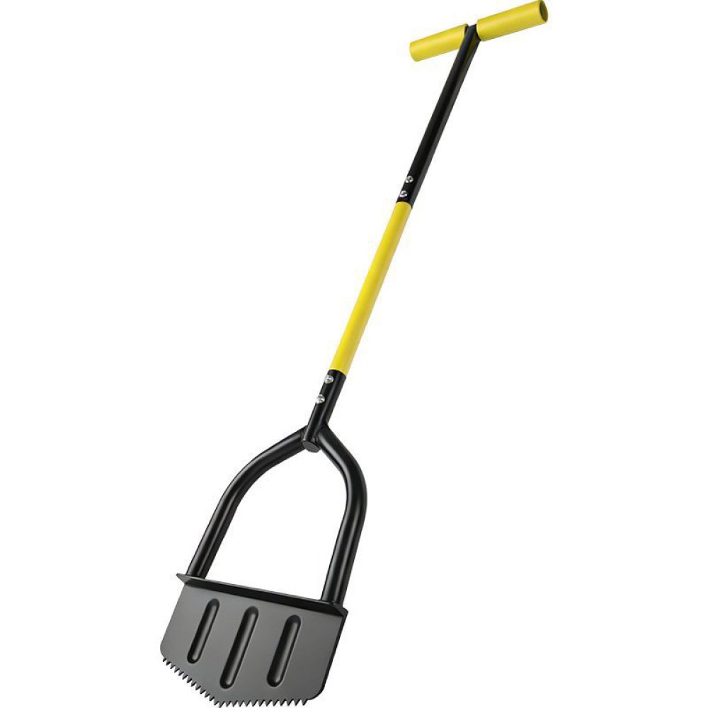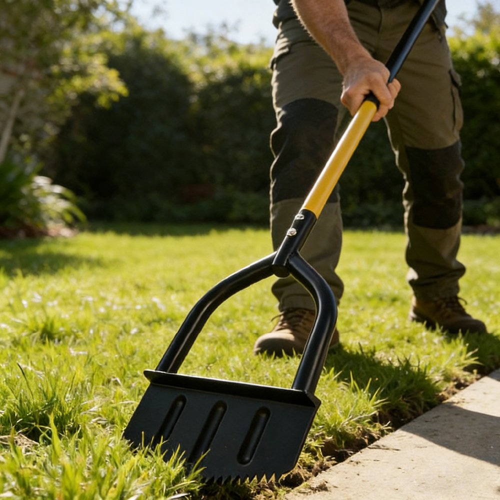 The tool is equipped with a durable steel blade with serrated edges, enabling easy penetration into soil and grass roots for sharp, defined edging results. Its reinforced steel frame construction ensures long-lasting performance and resistance to bending under pressure.