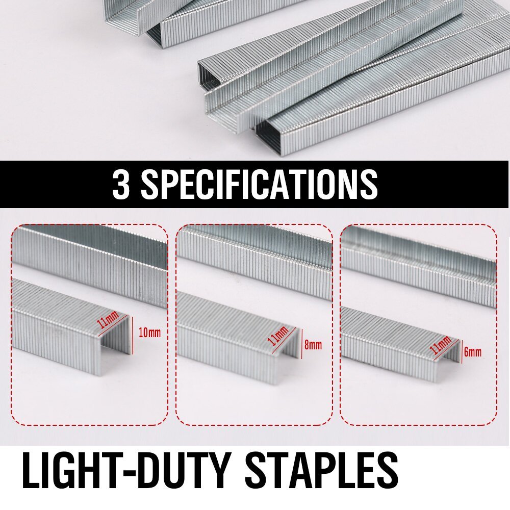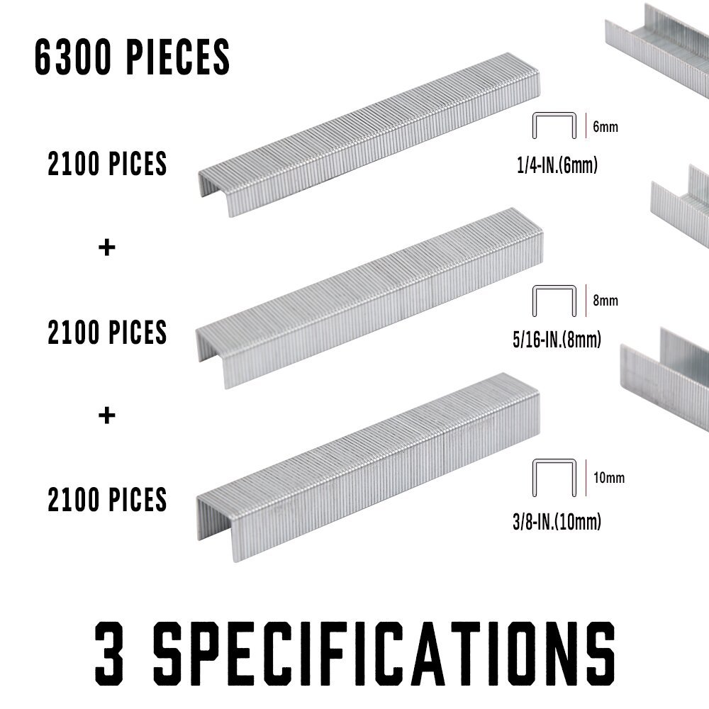 This 2100-piece staple gun staples set includes three commonly used sizes—6mm, 8mm, and 10mm—designed to meet a wide range of fastening needs in woodworking, upholstery, and general repairs. The assortment provides flexibility for different material thicknesses, making it suitable for both professional and DIY applications.