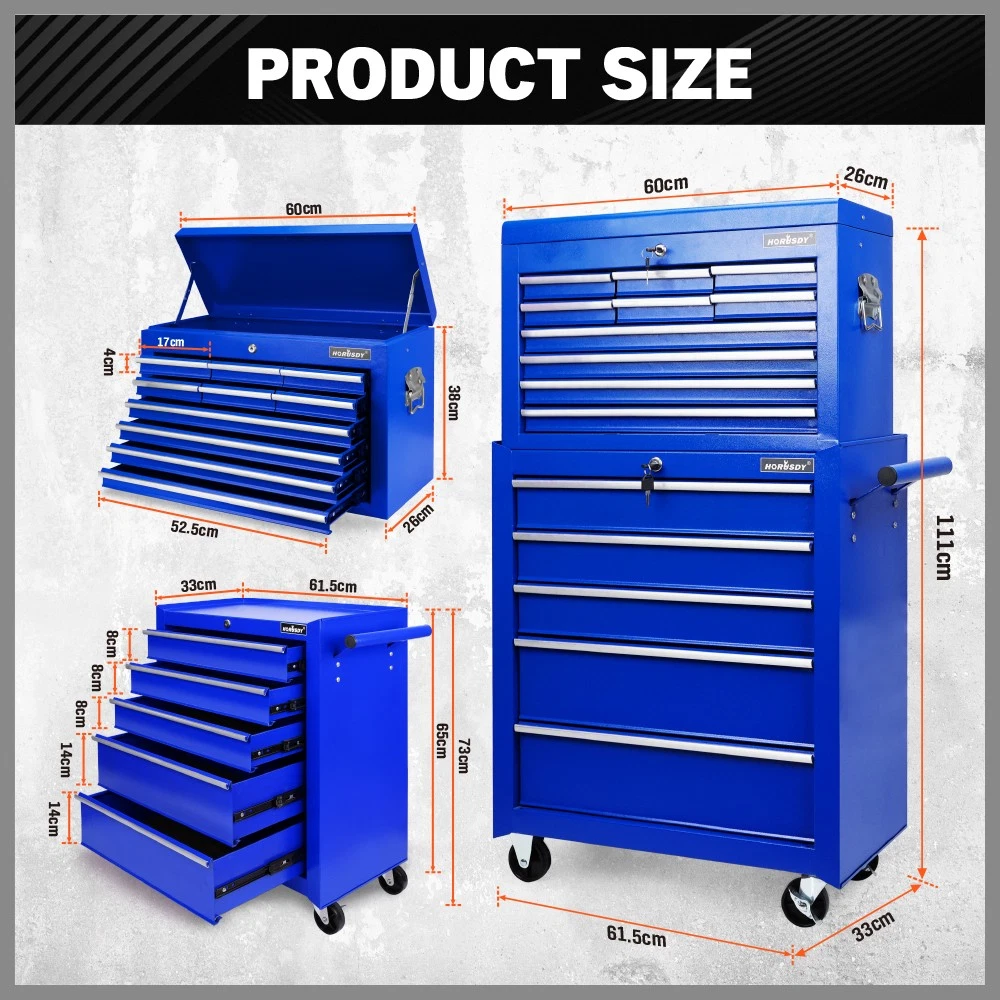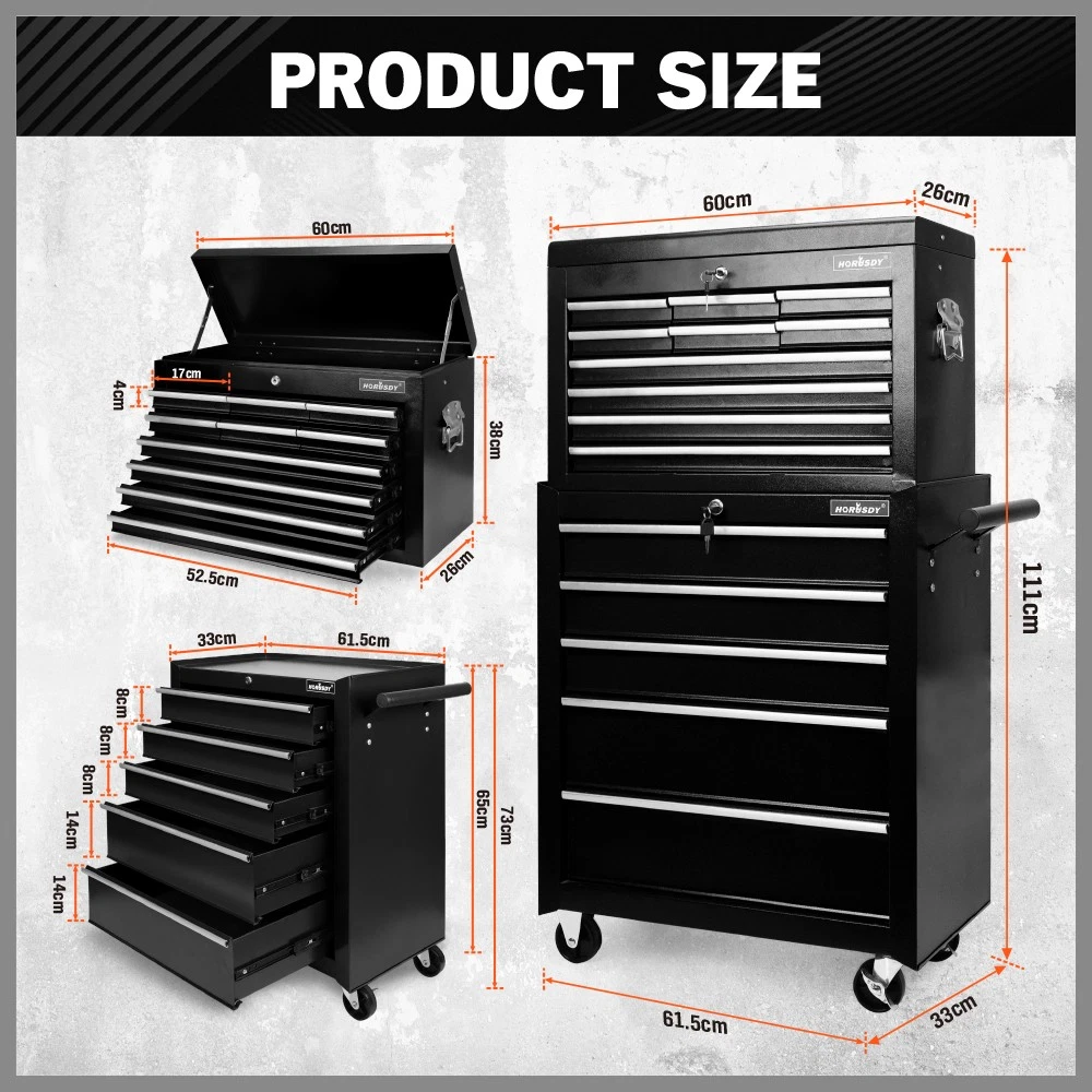 Organize and protect your tools with the HORUSDY Tool Box Chest Cabinet Trolley. Made from powder-coated high-tensile steel, this range of tool storage products is designed to accommodate various tool sizes. Each product is constructed with thick, sturdy metal and features large storage capacities, sturdy handles, and lined drawers to keep your tools secure and prevent movement. The upgraded cam barrel locks provide reliable and hassle-free security. The trolley and cart are equipped with omni-directional castor wheels for easy mobility. Available in multiple sizes and colors, these tool boxes are the perfect solution for your garage storage needs.